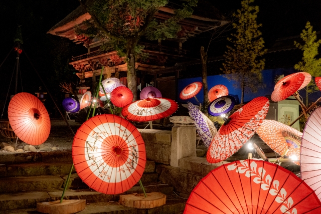夜の世界に浮かび上がるライトアップされた和傘がめちゃくちゃ幻想的で大人気なんです✨