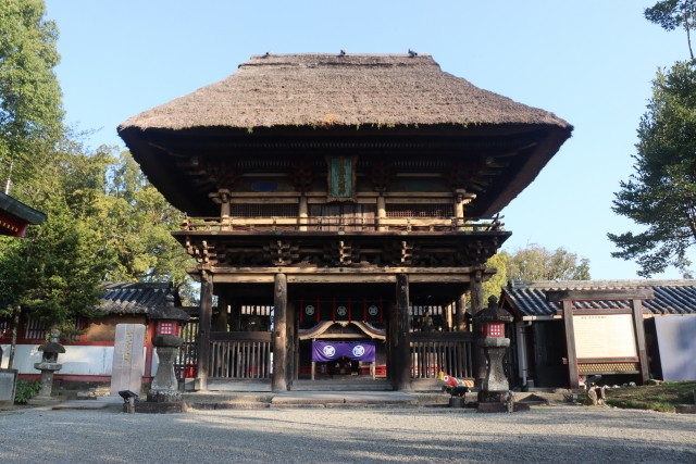 最大の見どころは、厚く茅が葺かれた屋根と朱塗りの本殿